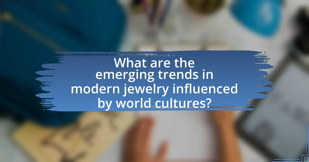 Emerging trends in modern jewelry influenced by world cultures include the incorporation of sustainable materials, the use of traditional craftsmanship techniques, and the blending of cultural motifs. Sustainable materials, such as recycled metals and ethically sourced gemstones, reflect a growing awareness of environmental impact, as seen in brands like Brilliant Earth, which emphasizes eco-friendly practices. Traditional craftsmanship techniques, such as hand-hammering and intricate beadwork, are being revived, showcasing the artistry of cultures like Indian and African artisans. Additionally, the blending of cultural motifs, such as combining Native American designs with contemporary aesthetics, highlights a global exchange of ideas, as evidenced by collaborations between designers from different backgrounds. These trends illustrate a fusion of heritage and modernity, creating unique pieces that resonate with diverse audiences.
